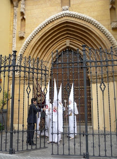 In Spain, religion is taking seriously. Ceramic virgins grace every mantle, kids are given Catholic names and every bar is named Saint This or Saint That. Religion brings pilgrims to Sevilla to see the field where the Divine Pastor appeared to Saint Isidore, religion relegates that shops be closed Sundays (one of my biggest complaints about Spain) and this Catholic religion fills the streets of penitent worshippers during Holy Week, garnering money and providing scenes such as this one: